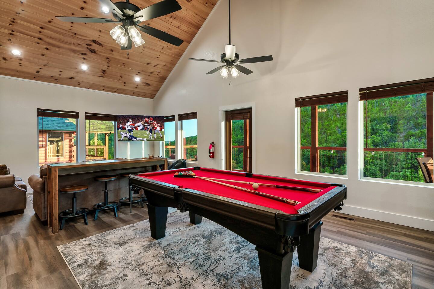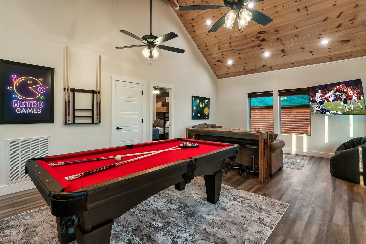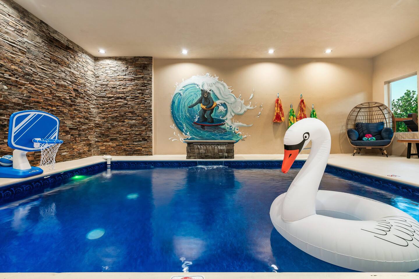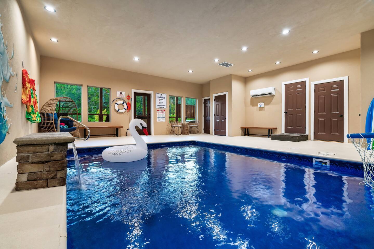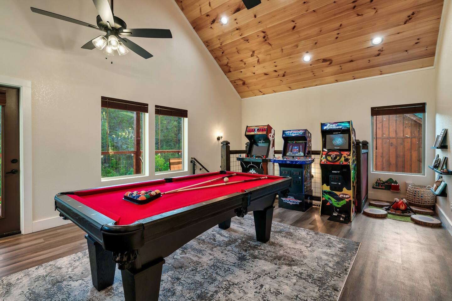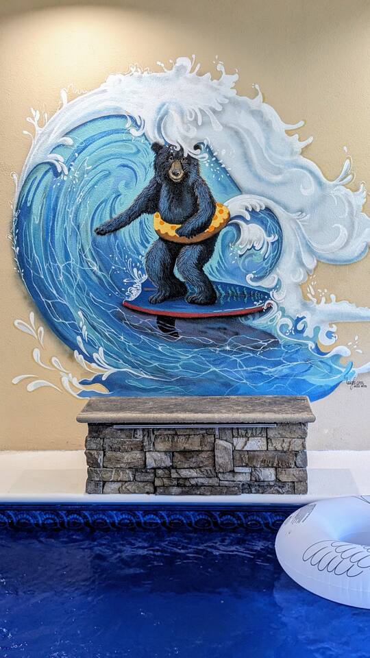 Reasons you'll LOVE The Surfin' Bear Lodge + HUGE 18' x 14' indoor private pool + Excellent location, 3.5 miles to the Parkway with wide, paved, easy to navigate roads + UBEREats, Walmart+ delivery available + Brand new construction with a modern rustic interior + Smart TVs in EVERY bedroom and living room (6 total) streaming Disney+, Hulu, Netflix, and FUBO for live SPORTS + Several CHILD-PROOFING features including retractable BABY GATES on all stairs, outlet covers, and video baby monitor + TWO pack n plays and an easy to clean high chair + Kiddie corner featuring Toniebox screen free entertainment, books, and wooden toys + Hot tub, gas fire pit, and 3 levels of outdoor deck space + DECORATED FOR CHRISTMAS *MAIN LEVEL - KITCHEN, DINING, LIVING, KING SUITE* Enter the cabin and you will be delighted by the full size galley style kitchen with sparkling countertops and all new stainless steel appliances. The kitchen flows through into the large dining area with seating for 8. The dining area is open to the stylish main floor living room equipped with an electric fireplace, large Smart TV, and queen sized sleeper sofa with a plush 3" memory foam mattress topper for added comfort. The large main floor bathroom is accessible from both the living area and master suite and features a shower/tub combo perfect for bath time. The spacious master suite features a smart TV, dresser, and cozy side chair. A large deck with modern yet comfortable seating finishes off the main floor. *LOWER LEVEL - POOL & HOT TUB* Descend down the stairs to your private oasis! Separated from the upstairs with an auto locking door for safety, the pool room features a state of the art 18' x 14' heated pool - one of the LARGEST indoor pools you will find in a cabin. The pool is heated between 78-82 degrees year round. You will be dazzled by the waterfall feature and LED lights. Plenty of space in the pool for the whole family to enjoy a game of pool basketball. Lounge in an oversized egg chair or relax on a floatie. A lower deck with rocking chairs and hot tub finish out this level. A full size washer and dryer and half bath are also located on this level for your convenience. *UPPER LEVEL - GAME ROOM, KING SUITE, BUNK ROOM w/QUEEN BED* The fun continues upstairs! Play a round of pool while watching the big game on the huge Smart TV. Kids and adults alike will enjoy the 3 arcade games. Last but certainly not least a dedicated kiddie corner for our youngest guests. Little ones will LOVE the Toniebox audio player, books, and plush campfire toy. Speaking of campfires - head out to the top level deck featuring a gas fire table perfect for roasting marshmallows! For sleeping this level features another king suite with private ensuite bathroom, a bunk room with a low twin over twin bunk, standalone queen bed, and ensuite bathroom (also accessible from game room). Lastly, there is a a queen sized sleeper sofa with 3" memory foam mattress topper.
