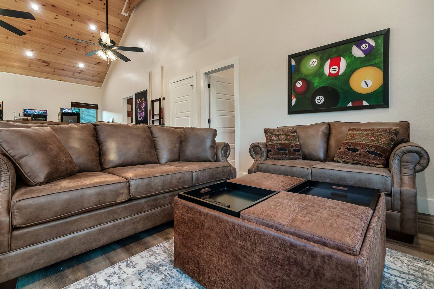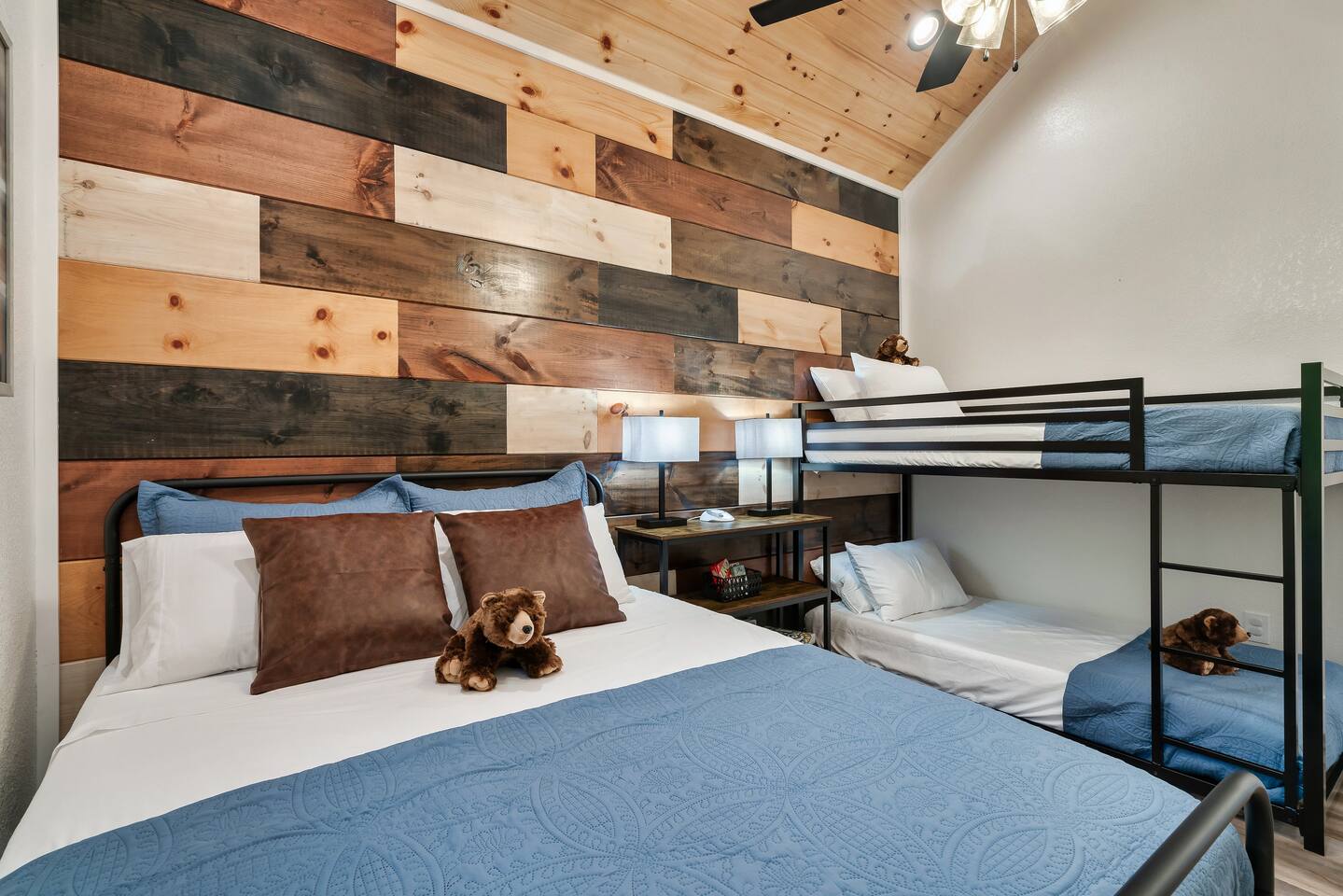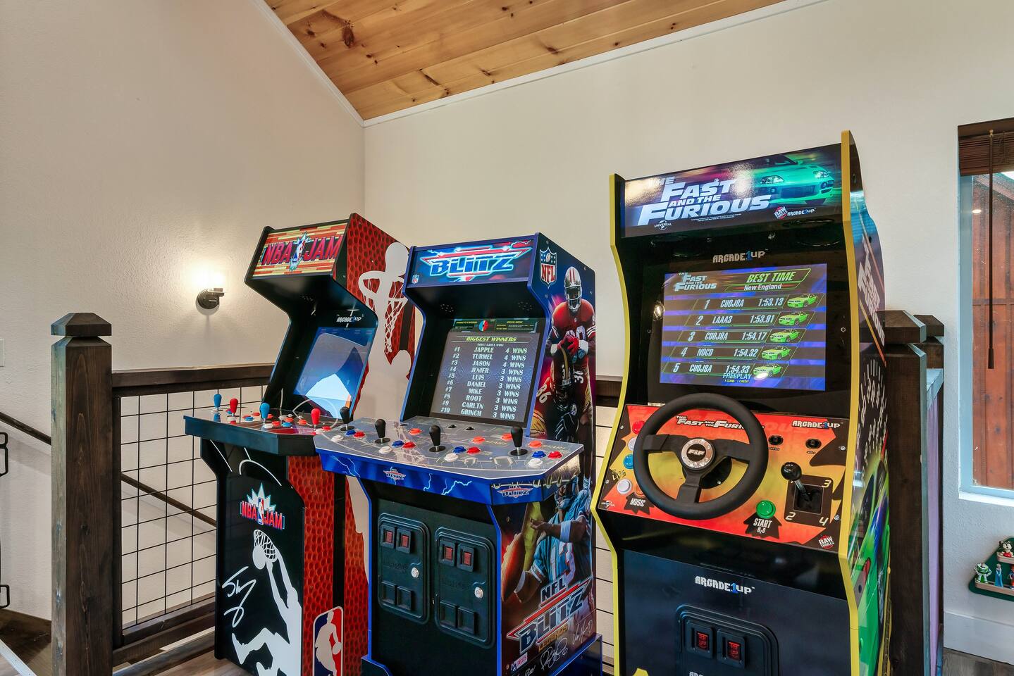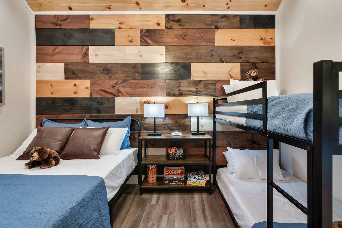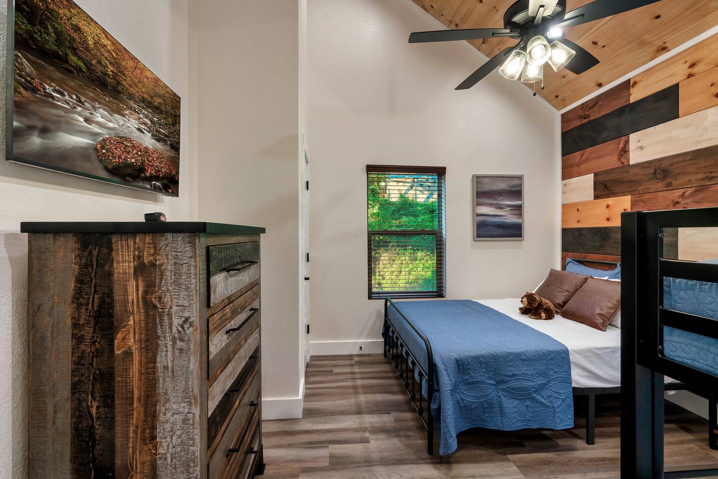 Reasons you'll LOVE The Surfin' Bear Lodge + HUGE 18' x 14' indoor private pool + Excellent location, 3.5 miles to the Parkway with wide, paved, easy to navigate roads + UBEREats, Walmart+ delivery available + Brand new construction with a modern rustic interior + Smart TVs in EVERY bedroom and living room (6 total) streaming Disney+, Hulu, Netflix, and FUBO for live SPORTS + Several CHILD-PROOFING features including retractable BABY GATES on all stairs, outlet covers, and video baby monitor + TWO pack n plays and an easy to clean high chair + Kiddie corner featuring Toniebox screen free entertainment, books, and wooden toys + Hot tub, gas fire pit, and 3 levels of outdoor deck space + DECORATED FOR CHRISTMAS *MAIN LEVEL - KITCHEN, DINING, LIVING, KING SUITE* Enter the cabin and you will be delighted by the full size galley style kitchen with sparkling countertops and all new stainless steel appliances. The kitchen flows through into the large dining area with seating for 8. The dining area is open to the stylish main floor living room equipped with an electric fireplace, large Smart TV, and queen sized sleeper sofa with a plush 3" memory foam mattress topper for added comfort. The large main floor bathroom is accessible from both the living area and master suite and features a shower/tub combo perfect for bath time. The spacious master suite features a smart TV, dresser, and cozy side chair. A large deck with modern yet comfortable seating finishes off the main floor. *LOWER LEVEL - POOL & HOT TUB* Descend down the stairs to your private oasis! Separated from the upstairs with an auto locking door for safety, the pool room features a state of the art 18' x 14' heated pool - one of the LARGEST indoor pools you will find in a cabin. The pool is heated between 78-82 degrees year round. You will be dazzled by the waterfall feature and LED lights. Plenty of space in the pool for the whole family to enjoy a game of pool basketball. Lounge in an oversized egg chair or relax on a floatie. A lower deck with rocking chairs and hot tub finish out this level. A full size washer and dryer and half bath are also located on this level for your convenience. *UPPER LEVEL - GAME ROOM, KING SUITE, BUNK ROOM w/QUEEN BED* The fun continues upstairs! Play a round of pool while watching the big game on the huge Smart TV. Kids and adults alike will enjoy the 3 arcade games. Last but certainly not least a dedicated kiddie corner for our youngest guests. Little ones will LOVE the Toniebox audio player, books, and plush campfire toy. Speaking of campfires - head out to the top level deck featuring a gas fire table perfect for roasting marshmallows! For sleeping this level features another king suite with private ensuite bathroom, a bunk room with a low twin over twin bunk, standalone queen bed, and ensuite bathroom (also accessible from game room). Lastly, there is a a queen sized sleeper sofa with 3" memory foam mattress topper.