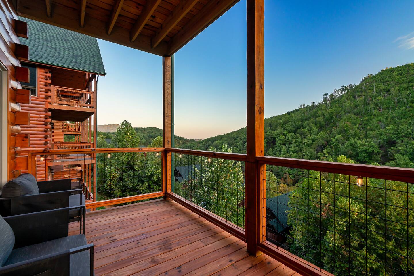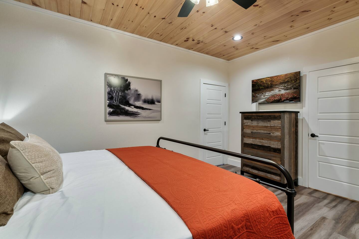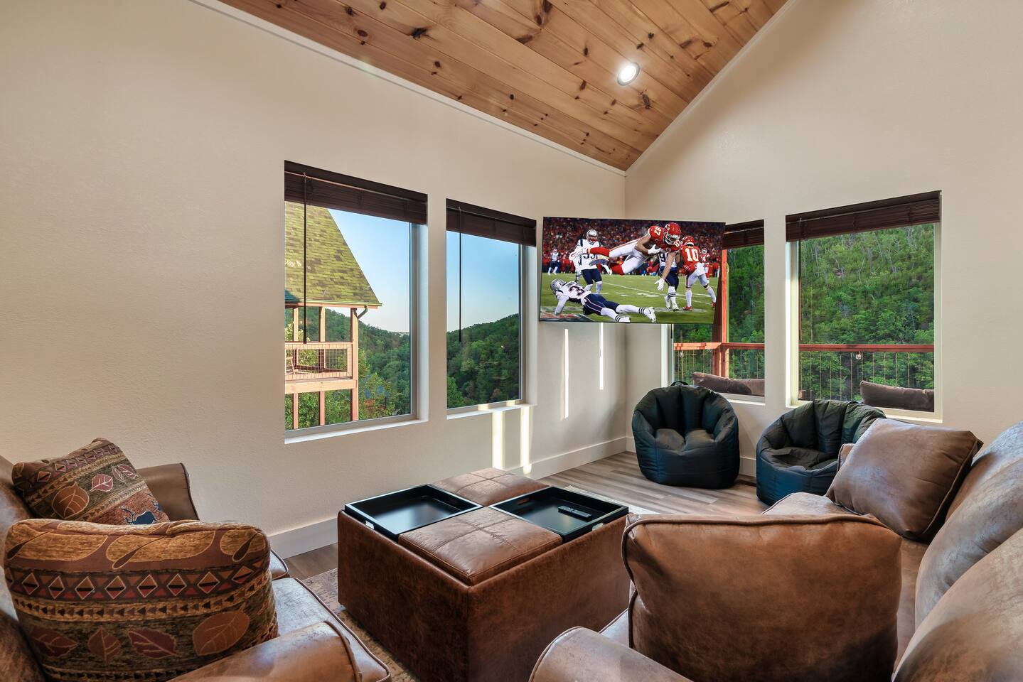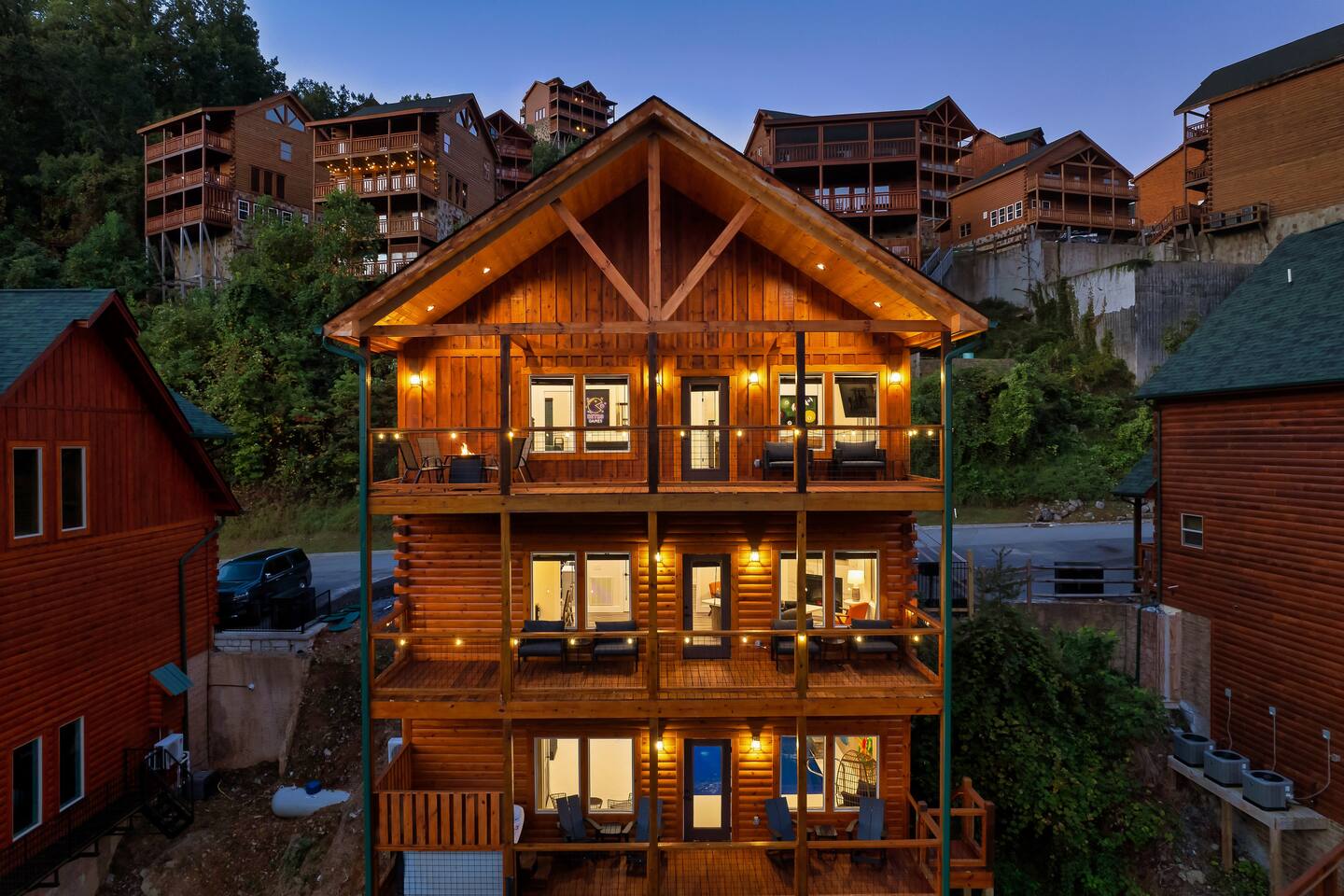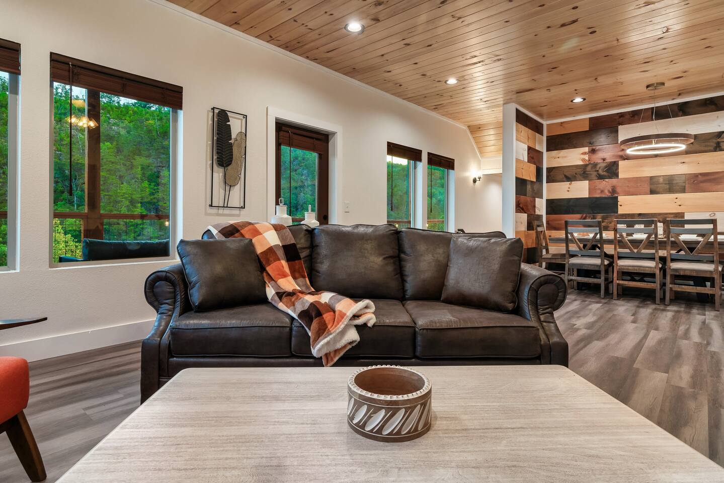 Reasons you'll LOVE The Surfin' Bear Lodge + HUGE 18' x 14' indoor private pool + Excellent location, 3.5 miles to the Parkway with wide, paved, easy to navigate roads + UBEREats, Walmart+ delivery available + Brand new construction with a modern rustic interior + Smart TVs in EVERY bedroom and living room (6 total) streaming Disney+, Hulu, Netflix, and FUBO for live SPORTS + Several CHILD-PROOFING features including retractable BABY GATES on all stairs, outlet covers, and video baby monitor + TWO pack n plays and an easy to clean high chair + Kiddie corner featuring Toniebox screen free entertainment, books, and wooden toys + Hot tub, gas fire pit, and 3 levels of outdoor deck space + DECORATED FOR CHRISTMAS *MAIN LEVEL - KITCHEN, DINING, LIVING, KING SUITE* Enter the cabin and you will be delighted by the full size galley style kitchen with sparkling countertops and all new stainless steel appliances. The kitchen flows through into the large dining area with seating for 8. The dining area is open to the stylish main floor living room equipped with an electric fireplace, large Smart TV, and queen sized sleeper sofa with a plush 3" memory foam mattress topper for added comfort. The large main floor bathroom is accessible from both the living area and master suite and features a shower/tub combo perfect for bath time. The spacious master suite features a smart TV, dresser, and cozy side chair. A large deck with modern yet comfortable seating finishes off the main floor. *LOWER LEVEL - POOL & HOT TUB* Descend down the stairs to your private oasis! Separated from the upstairs with an auto locking door for safety, the pool room features a state of the art 18' x 14' heated pool - one of the LARGEST indoor pools you will find in a cabin. The pool is heated between 78-82 degrees year round. You will be dazzled by the waterfall feature and LED lights. Plenty of space in the pool for the whole family to enjoy a game of pool basketball. Lounge in an oversized egg chair or relax on a floatie. A lower deck with rocking chairs and hot tub finish out this level. A full size washer and dryer and half bath are also located on this level for your convenience. *UPPER LEVEL - GAME ROOM, KING SUITE, BUNK ROOM w/QUEEN BED* The fun continues upstairs! Play a round of pool while watching the big game on the huge Smart TV. Kids and adults alike will enjoy the 3 arcade games. Last but certainly not least a dedicated kiddie corner for our youngest guests. Little ones will LOVE the Toniebox audio player, books, and plush campfire toy. Speaking of campfires - head out to the top level deck featuring a gas fire table perfect for roasting marshmallows! For sleeping this level features another king suite with private ensuite bathroom, a bunk room with a low twin over twin bunk, standalone queen bed, and ensuite bathroom (also accessible from game room). Lastly, there is a a queen sized sleeper sofa with 3" memory foam mattress topper.