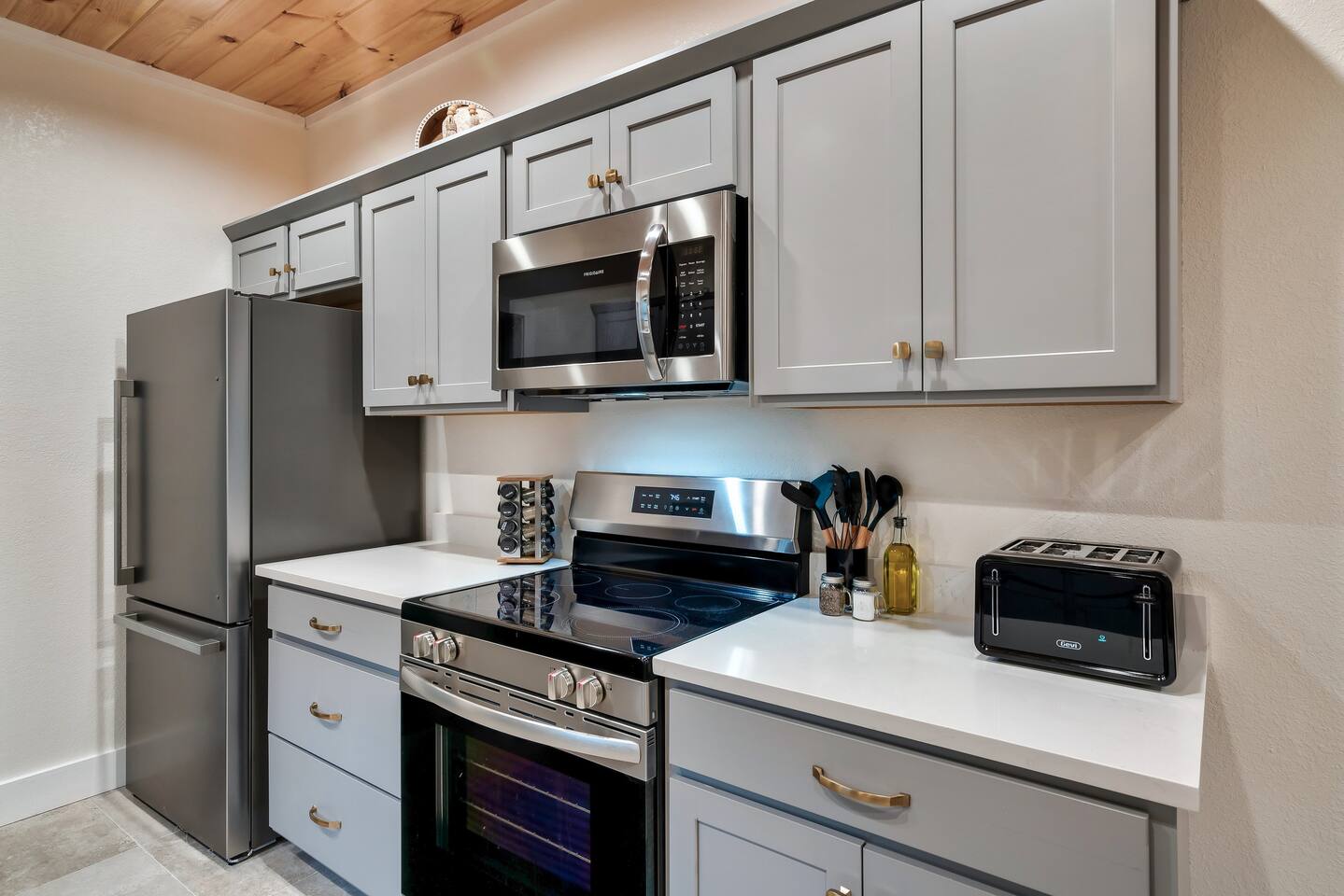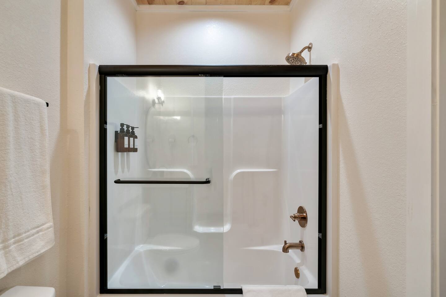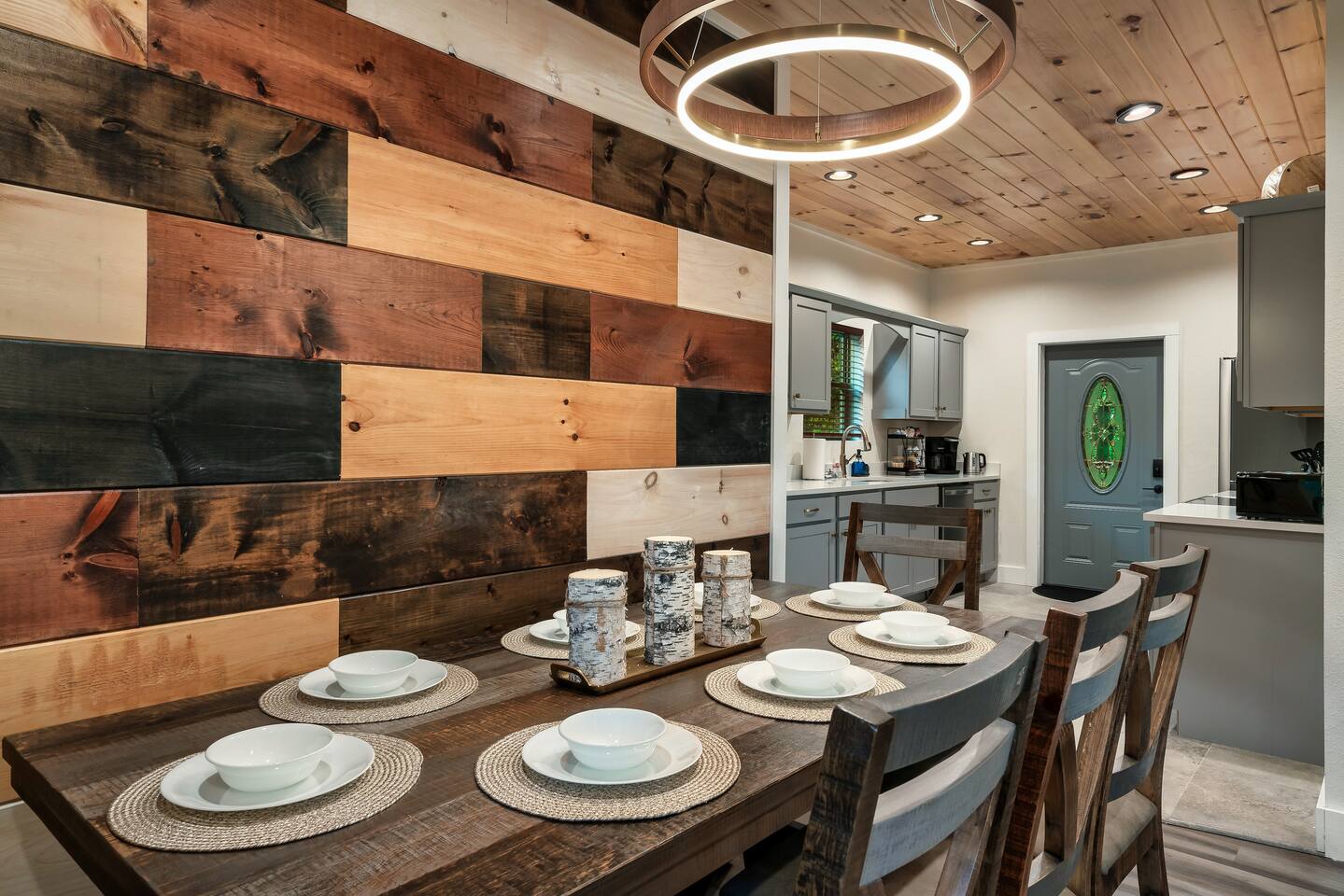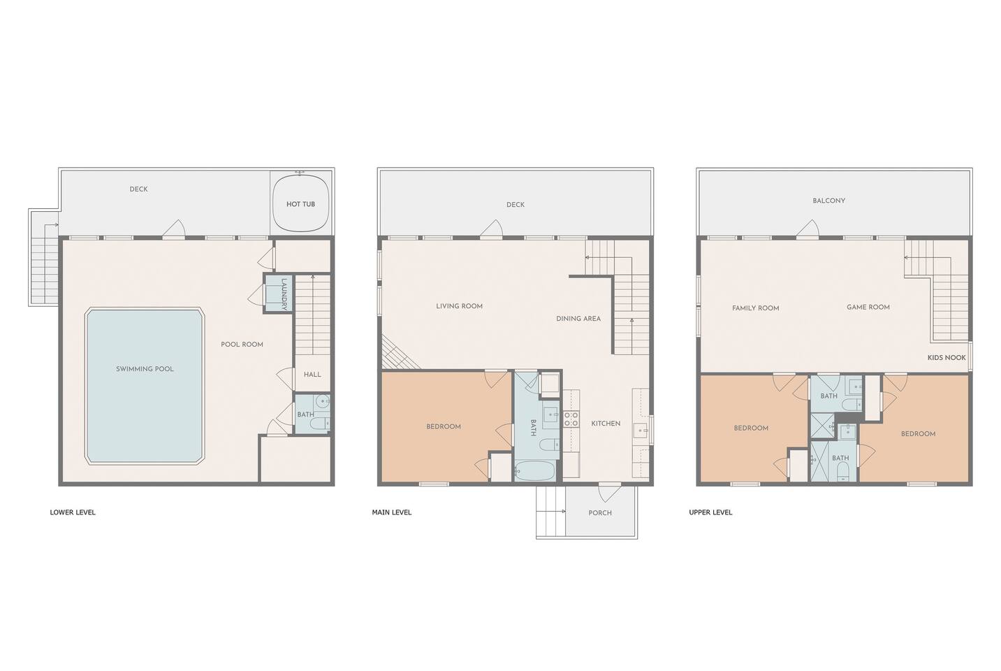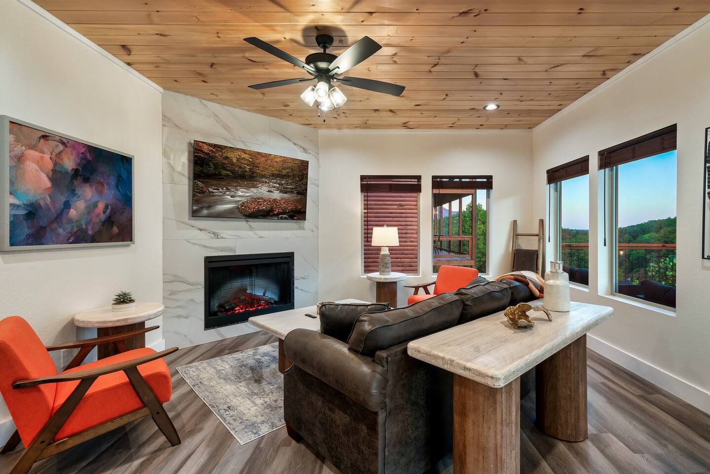 Reasons you'll LOVE The Surfin' Bear Lodge + HUGE 18' x 14' indoor private pool + Excellent location, 3.5 miles to the Parkway with wide, paved, easy to navigate roads + UBEREats, Walmart+ delivery available + Brand new construction with a modern rustic interior + Smart TVs in EVERY bedroom and living room (6 total) streaming Disney+, Hulu, Netflix, and FUBO for live SPORTS + Several CHILD-PROOFING features including retractable BABY GATES on all stairs, outlet covers, and video baby monitor + TWO pack n plays and an easy to clean high chair + Kiddie corner featuring Toniebox screen free entertainment, books, and wooden toys + Hot tub, gas fire pit, and 3 levels of outdoor deck space + DECORATED FOR CHRISTMAS *MAIN LEVEL - KITCHEN, DINING, LIVING, KING SUITE* Enter the cabin and you will be delighted by the full size galley style kitchen with sparkling countertops and all new stainless steel appliances. The kitchen flows through into the large dining area with seating for 8. The dining area is open to the stylish main floor living room equipped with an electric fireplace, large Smart TV, and queen sized sleeper sofa with a plush 3" memory foam mattress topper for added comfort. The large main floor bathroom is accessible from both the living area and master suite and features a shower/tub combo perfect for bath time. The spacious master suite features a smart TV, dresser, and cozy side chair. A large deck with modern yet comfortable seating finishes off the main floor. *LOWER LEVEL - POOL & HOT TUB* Descend down the stairs to your private oasis! Separated from the upstairs with an auto locking door for safety, the pool room features a state of the art 18' x 14' heated pool - one of the LARGEST indoor pools you will find in a cabin. The pool is heated between 78-82 degrees year round. You will be dazzled by the waterfall feature and LED lights. Plenty of space in the pool for the whole family to enjoy a game of pool basketball. Lounge in an oversized egg chair or relax on a floatie. A lower deck with rocking chairs and hot tub finish out this level. A full size washer and dryer and half bath are also located on this level for your convenience. *UPPER LEVEL - GAME ROOM, KING SUITE, BUNK ROOM w/QUEEN BED* The fun continues upstairs! Play a round of pool while watching the big game on the huge Smart TV. Kids and adults alike will enjoy the 3 arcade games. Last but certainly not least a dedicated kiddie corner for our youngest guests. Little ones will LOVE the Toniebox audio player, books, and plush campfire toy. Speaking of campfires - head out to the top level deck featuring a gas fire table perfect for roasting marshmallows! For sleeping this level features another king suite with private ensuite bathroom, a bunk room with a low twin over twin bunk, standalone queen bed, and ensuite bathroom (also accessible from game room). Lastly, there is a a queen sized sleeper sofa with 3" memory foam mattress topper.