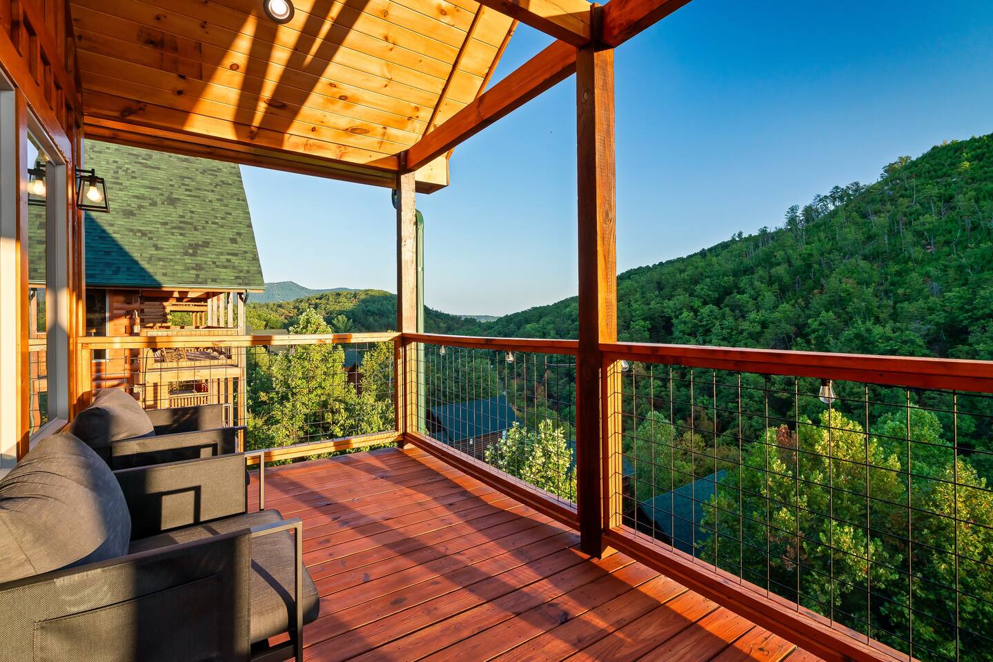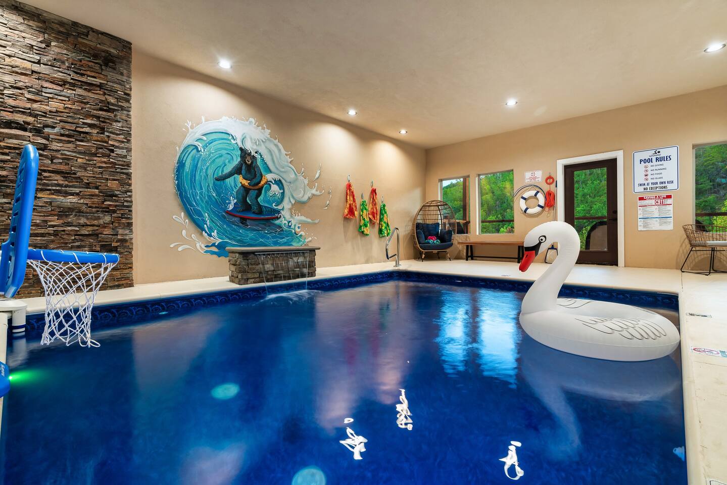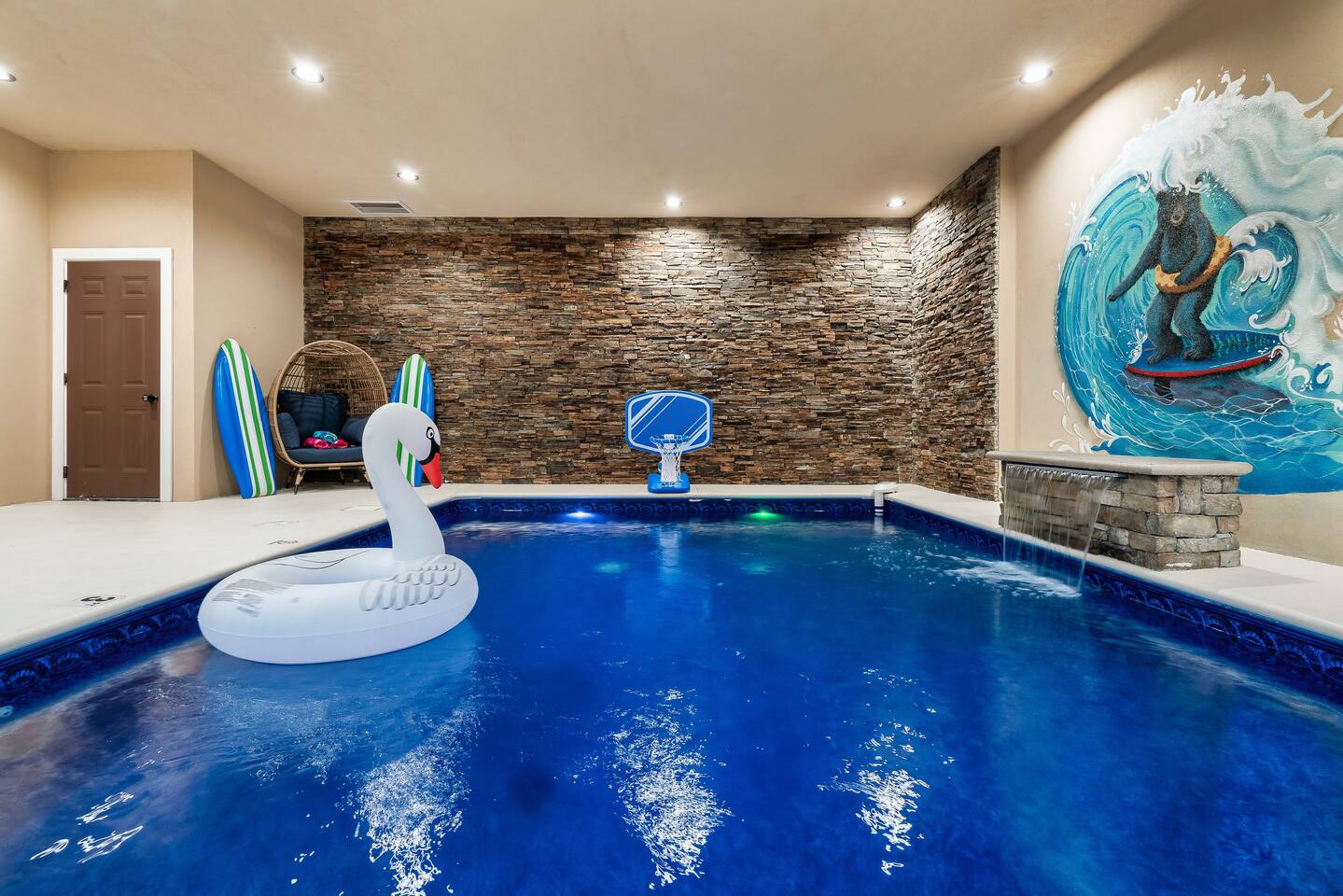**THE SURFIN' BEAR** The most family-friendly cabin you will find, designed with all ages in mind! This brand new modern rustic cabin is only 3 miles from the Parkway in Pigeon Forge and features a HUGE (18'x14') indoor pool, hot tub, game room with pool table, arcade, and kiddie corner, full size kitchen, and 3 levels of decks with stunning mountain views. The practical traveler will appreciate the smooth, easy to navigate roads, the large, flat parking area, and super fast wifi.
